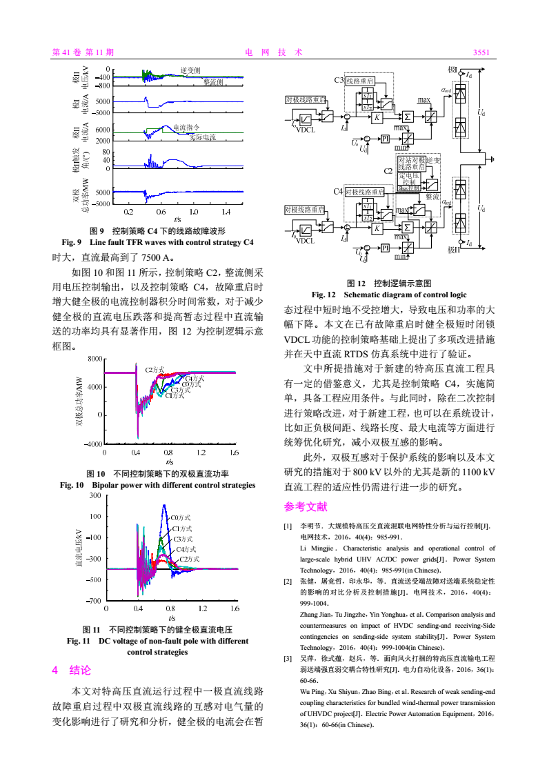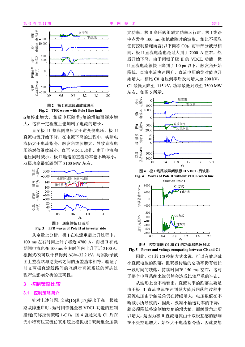 摘要:針對(duì)特高壓直流(ultra-high voltage direct current,UHVDC)運(yùn)行過程中一極直流線路故障重啟時(shí)對(duì)另一健全極運(yùn)行產(chǎn)生影響的問題,考慮雙極直流線路間的互感,對(duì)暫態(tài)過程中雙極電氣量特征進(jìn)行深入研究。根據(jù)暫態(tài)過程中的電壓計(jì)算公式,對(duì)雙極之間的影響進(jìn)行了數(shù)值計(jì)算和物理解釋并對(duì)影響功率跌落的因素進(jìn)行分析,在已有健全極短時(shí)閉鎖低壓限流功能(voltage dependent current limit,VDCL)的控制措施基礎(chǔ)上提出了多項(xiàng)控制策略。以天中直流為研究對(duì)象,通過實(shí)時(shí)數(shù)字仿真(real-time digital simulator,RTDS)系統(tǒng)建立與實(shí)際一次系統(tǒng)和實(shí)際控制保護(hù)程序完全一致的仿真模型,對(duì)改進(jìn)策略進(jìn)行優(yōu)化比較研究,驗(yàn)證了在故障極重啟期間健全極整流側(cè)采用定電壓控制以及改變健全極的電流控制器參數(shù)兩項(xiàng)控制措施的有效性,最后提出了工程應(yīng)用建議。