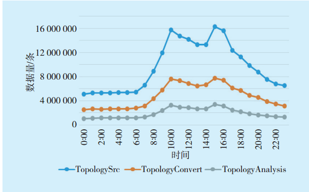 其中,影響不同拓?fù)涮幚硭俣鹊脑蛟谟冢呵爸猛負(fù)鋽?shù)據(jù)的輸出效率及每個(gè)拓?fù)涞臉I(yè)務(wù)實(shí)現(xiàn)邏輯,TopologySrc每時(shí)刻處理的數(shù)據(jù)量最大,因?yàn)門opologySrc處理的采集裝置通過(guò)消息隊(duì)列Kafka推送到Storm的數(shù)據(jù),而TopologySrc要做去重去噪會(huì)過(guò)濾掉一半左右不符合規(guī)范的數(shù)據(jù),故TopologyConvert中需處理的數(shù)據(jù)量就減少了。同時(shí),TopologyConvert是TopologyAnalysis的前置,這也決定了TopologyAnalysis處理的數(shù)據(jù)量。