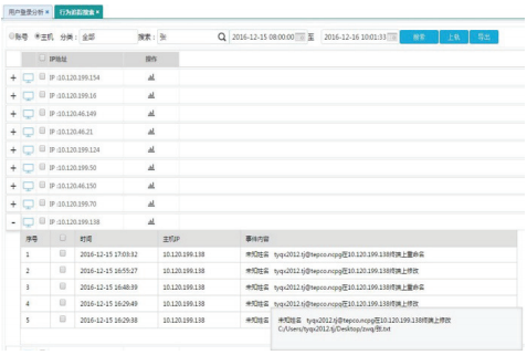 行為追蹤搜索可根據(jù)搜索條件快速檢索行為審計中心模塊中的相應(yīng)事件,可以按照賬號和主機(jī)IP進(jìn)行展示,且可以將查詢出來的數(shù)據(jù)導(dǎo)出(見圖5)。