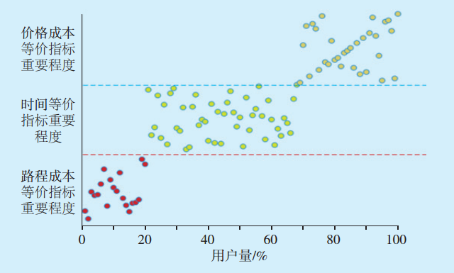在計(jì)算過(guò)程中,λj只與偏好矩陣和目標(biāo)函數(shù)重要程度有關(guān)。為保證指標(biāo)評(píng)價(jià)權(quán)重的準(zhǔn)確性,隨機(jī)挑選100組每組100人的電動(dòng)汽車用戶作為樣本進(jìn)行調(diào)研,考察用戶對(duì)于時(shí)間、路程、價(jià)格3個(gè)指標(biāo)的看重程度,并將結(jié)果進(jìn)行散點(diǎn)分析,用戶評(píng)價(jià)散點(diǎn)分析如圖5所示。