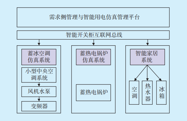 用戶側用能仿真系統(tǒng)可包含蓄冰空調半實物仿真系統(tǒng)、蓄熱電鍋爐半實物仿真系統(tǒng)、智能家居半實物仿真系統(tǒng)等一系列應用。電力需求側管理與智能用電仿真管理平臺架構如圖3所示。