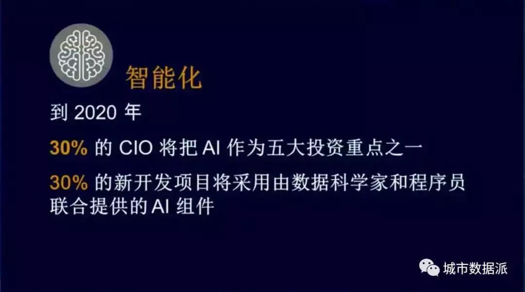 我們有一個預(yù)測,到2020年30%的首席信息官會把人工智能作為他的五大投資重點之一。在一個企業(yè)里面,或者政府機關(guān)里面有一個首席信息官的崗位,每年要花大量的IT支出,今天來講會花在前五名的云計算、大數(shù)據(jù)、傳統(tǒng)網(wǎng)絡(luò)、移動、數(shù)字化營銷等等,而人工智能在今天這個時段還沒有排到前十名,但是三年以后我們預(yù)計它會排到前五名。