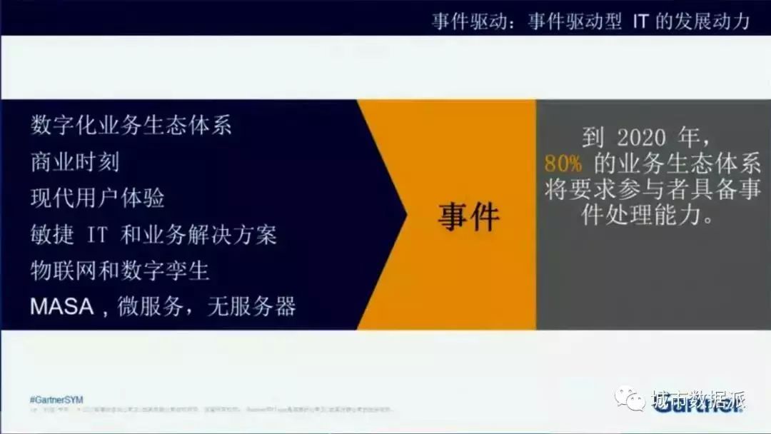 我們預(yù)計到2020年,80%的生態(tài)體系要求具備這樣的能力,做生意5%的生意就是沒有人參與的,不是人來買你的東西,而是物來買你的東西。5%大家聽上去是很小的數(shù)目,其實是個很大的數(shù)目,所以很多市場家都會跑進來參與一把。做冰箱的就考慮我圍繞著做冰箱這件事情,不光光是把冰箱賣給你,我要圍繞著冰箱有一個生態(tài)體系,建立冰箱生態(tài)體系。冰箱看見你沒有牛奶了,下一個訂單到超市,這是我和超市連在一起。冰箱看見自己需要某一方面的維護保養(yǎng)工作了,我自己發(fā)一個訂單到維護保養(yǎng)的公司,維護保養(yǎng)的公司派個人到你家里來做冰箱的保養(yǎng)工作。冰箱看見你每天都吃不健康的食品,發(fā)一個信息告訴你你要鍛煉身體了,我要跟健康運動的網(wǎng)站連在一起,把健康運動的網(wǎng)站也連到冰箱的生態(tài)體系當(dāng)中去。冰箱看見你里面今天放了雞蛋和西紅柿,可以推薦你一個食譜,這些都是冰箱可以做的事情。圍繞著冰箱形成的生態(tài)圈,這就是事件驅(qū)動帶來的新商業(yè)模式。