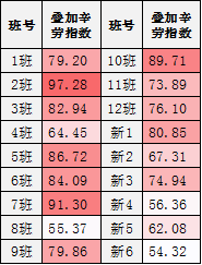 將一個自然月內工作日班次時長疲勞指數(shù)與班組構成系數(shù)相乘之和得出各班的工作辛勞指數(shù),在表5中指數(shù)越高顏色越深。