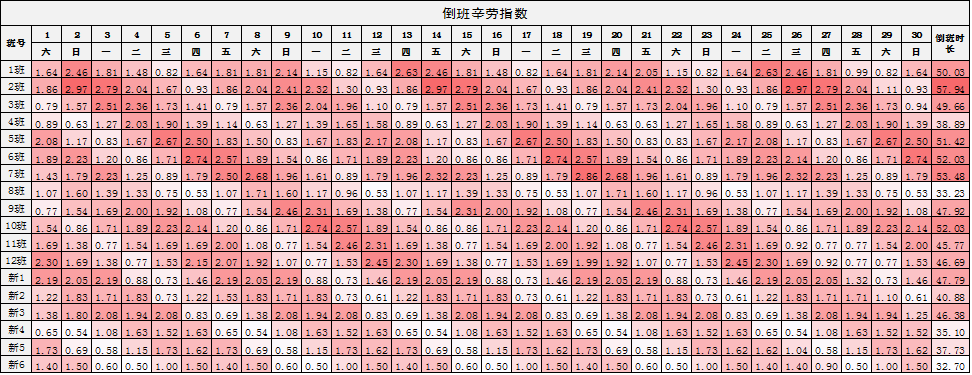 將一個自然月內倒班次數(shù)與班組構成系數(shù)相乘之和得出各班的倒班辛勞指數(shù),在表6中指數(shù)越高顏色越深。
