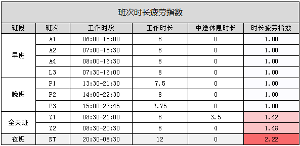 考慮到話務接聽連續(xù)性,各班次的工作開始和結束時間不能完全一致。根據(jù)電力客戶話務增長趨勢將工作開始時間8點和工作結束時間21點作為基本參照值,工作開始時間比8點每提前30分鐘,首末疲勞指數(shù)增加0.05;工作開始時間比21每延遲30分鐘,首末疲勞指數(shù)增加0.05,如表3所示。