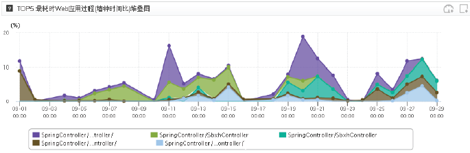 系統(tǒng)Web應(yīng)用過程分析結(jié)果如圖3、圖4所示。圖3展示了系統(tǒng)耗時排在前5的Web應(yīng)用過程,其中,SpringController/…troller/應(yīng)用過程耗時最高。圖4顯示當(dāng)月應(yīng)用吞吐率,13日—15日系統(tǒng)被頻繁調(diào)用,平均響應(yīng)時間較長。查看該應(yīng)用過程所執(zhí)行代碼,發(fā)現(xiàn)在調(diào)用“SendController.startTask”方法時耗時較多,運(yùn)維人員及時進(jìn)行了調(diào)優(yōu)處理。