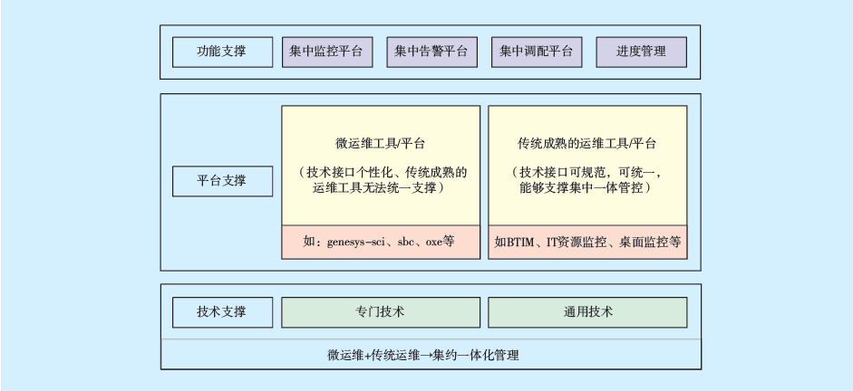2)平臺(tái)支撐:包含傳統(tǒng)成熟的運(yùn)維工具/平臺(tái)和因技術(shù)接口個(gè)性化、傳統(tǒng)成熟運(yùn)維工具無(wú)法統(tǒng)一支撐的“微運(yùn)維”工具/平臺(tái)。隨著業(yè)務(wù)范圍的擴(kuò)大,信息系統(tǒng)不斷開(kāi)發(fā)建設(shè),支撐對(duì)應(yīng)系統(tǒng)自動(dòng)監(jiān)控運(yùn)維的“微運(yùn)維”工具可基于該一體化監(jiān)控管理平臺(tái)不斷升級(jí)擴(kuò)展。