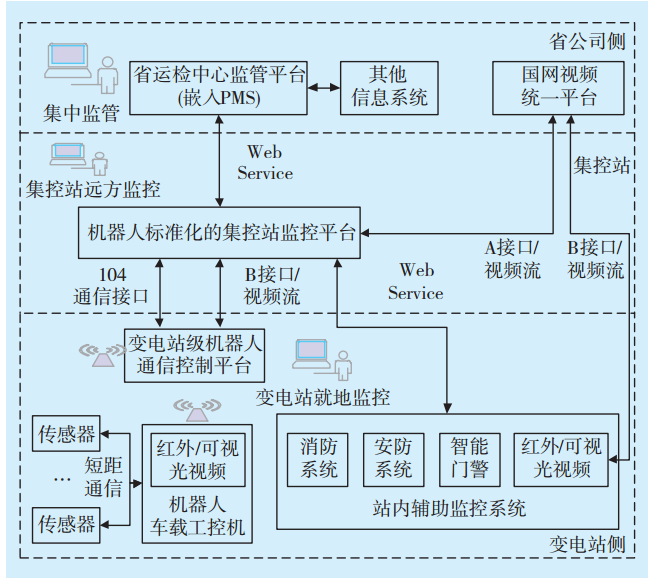 圖1給出了變電站巡檢機(jī)器人三級聯(lián)動監(jiān)控監(jiān)管體系的系統(tǒng)結(jié)構(gòu)及通信接口示意圖,體現(xiàn)了縱向貫通、橫向集成的基本原則。