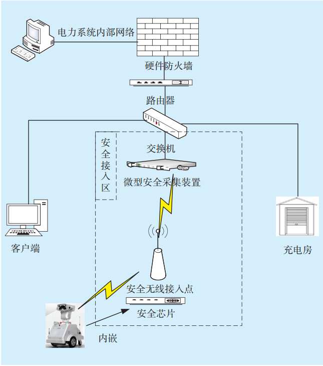 1)巡檢機(jī)器人內(nèi)嵌安全芯片,與變電站側(cè)微型安全采集裝置通信,并進(jìn)行身份認(rèn)證;