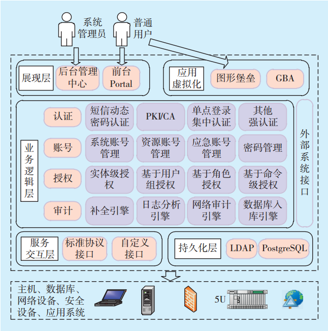 1)模塊架構(gòu)。運維安全審計模塊總體架構(gòu)分為6個層面:展現(xiàn)層、業(yè)務(wù)邏輯層、服務(wù)交互層、持久化層、虛擬化層、外部系統(tǒng)接口層(見圖2)。①用戶通過展現(xiàn)層訪問系統(tǒng)、維護系統(tǒng)。②業(yè)務(wù)邏輯層是核心功能模塊,實現(xiàn)自然人與賬號的關(guān)聯(lián)、用戶身份認(rèn)證、賬號權(quán)限管理、違規(guī)操作告警、用戶行為審計等功能。它通過服務(wù)交互層實現(xiàn)全設(shè)備管控,并將數(shù)據(jù)通過展現(xiàn)層向用戶展示。③服務(wù)交互層通過2種不同的接口類型實現(xiàn)對異構(gòu)的資源進行管理。④持久化層采用LDAP、PostgreSQL數(shù)據(jù)庫實現(xiàn)對資源信息的存儲整理。⑤外部系統(tǒng)接口層幫助展現(xiàn)層和服務(wù)交互層實現(xiàn)與統(tǒng)一權(quán)限系統(tǒng)賬號口令功能以及與I6000系統(tǒng)設(shè)備信息的集成。