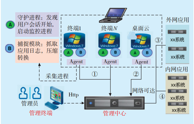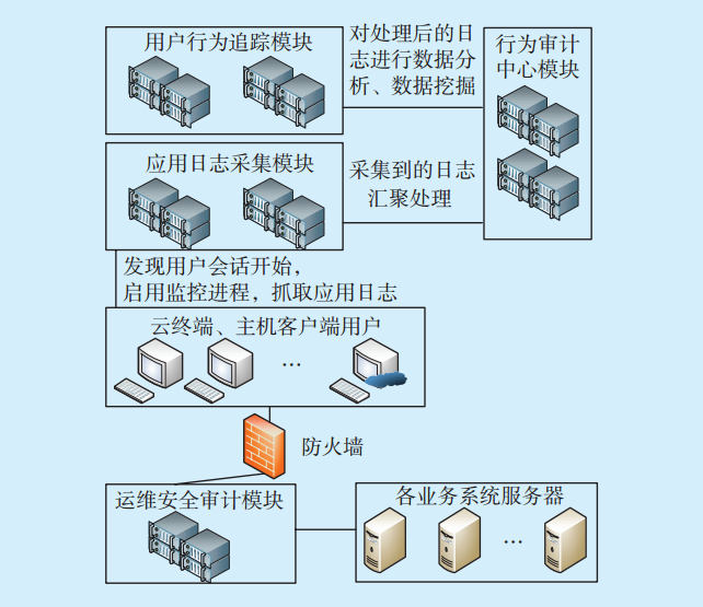 [1-2]。天津電力行為安全審計系統(tǒng)主要通過用戶行為追蹤、運維審計、應(yīng)用日志采集和行為審計中心這四大功能模塊,實現(xiàn)對信息系統(tǒng)用戶行為的全生命周期管理,為安全審計提供統(tǒng)一的平臺支撐。