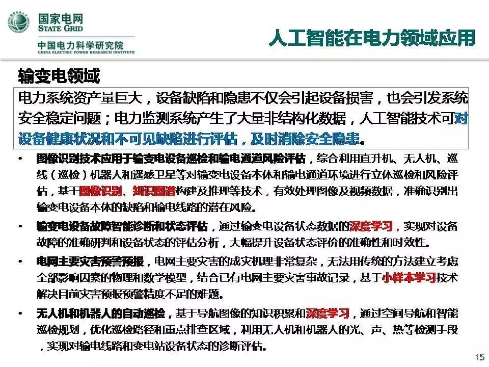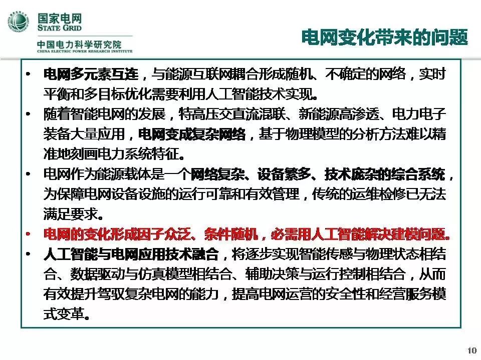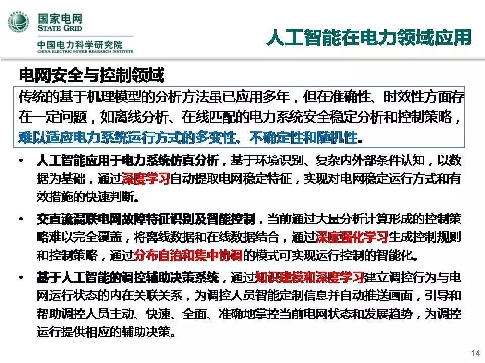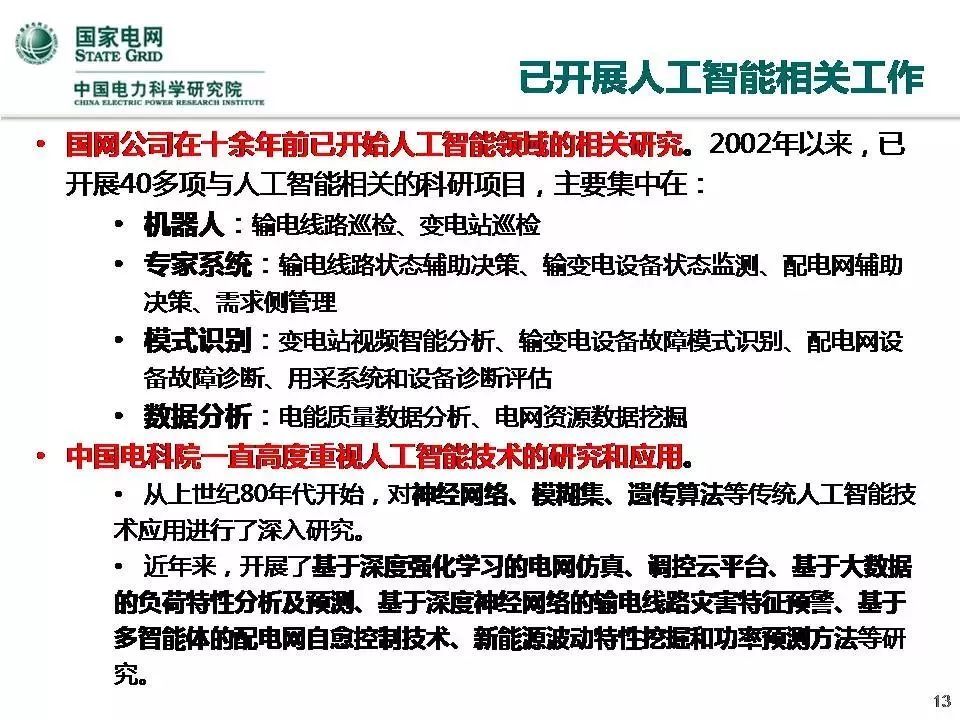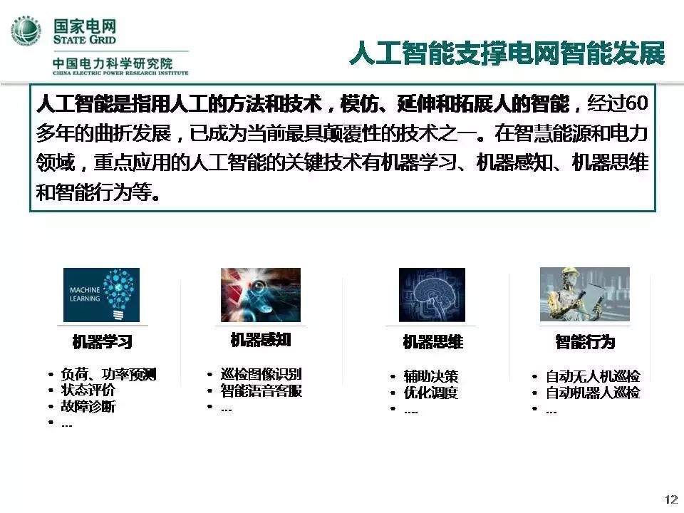 人工智能是當(dāng)前最具顛覆性的技術(shù)之一,各國政府、研究機(jī)構(gòu)和企業(yè)已積極行動(dòng),制定技術(shù)戰(zhàn)略、密切跟蹤最新技術(shù)發(fā)展。為探討人工智能技術(shù)在電力領(lǐng)域的應(yīng)用前景和方向,尋找人工智能在電力領(lǐng)域的著力點(diǎn)和突破點(diǎn),中國電科院于12月6日召開主題為“人工智能在電力領(lǐng)域的研究應(yīng)用方向和關(guān)鍵技術(shù)”的二零八科學(xué)會(huì)議,中國科學(xué)院院士周孝信、中國電科院總工程師湯涌、副總經(jīng)理(副院長)王繼業(yè)、副總經(jīng)理(副院長)高克利出席會(huì)議,來自國網(wǎng)公司、科研單位、高等院校的50余位專家參加。會(huì)上,中國電科院副總經(jīng)理(副院長)王繼業(yè)作了題為“人工智能在能源電力領(lǐng)域的探索”的報(bào)告,分享給大家。