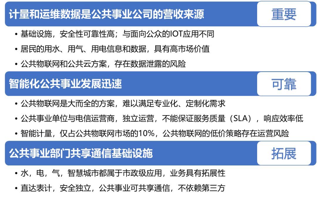 相比于公共的物聯(lián)網(wǎng)方案,專用物聯(lián)通信方案更加符合公共事業(yè)應(yīng)用和智慧城市應(yīng)用的要求,保證客戶的運(yùn)營安全,提高運(yùn)維效率,推動(dòng)產(chǎn)業(yè)持續(xù)創(chuàng)新和升級(jí)。