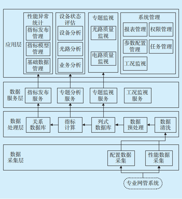 光傳輸設備網(wǎng)管系統(tǒng)包含豐富的數(shù)據(jù)資源,為了進一步挖掘數(shù)據(jù)價值,準確評估光傳輸設備的運行狀態(tài)和健康程度,以便安排計劃檢修或技術(shù)改造,國網(wǎng)溫州供電公司開展了基于專業(yè)網(wǎng)管系統(tǒng)的大數(shù)據(jù)分析研究,開發(fā)了通信光傳輸設備狀態(tài)評價系統(tǒng)。該系統(tǒng)通過北向接口從光傳輸設備網(wǎng)管系統(tǒng)提取