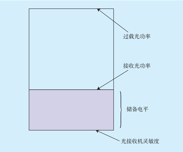 1)儲備電平。光接口實際收光功率不能高于過載光功率,也不能低于接收機靈敏度,否則該光路失效,不能正常通信。在設備投運之初,收光功率基本都能滿足以上條件,隨著運行年限的增加,設備逐步老化,光纜性能也逐步劣化,收光功率會慢慢降低。當收光功率降低到接收機靈敏度及以下時,通信誤碼會增多以致通信中斷。因此,本文提出了儲備電平的概念,儲備電平就是實際收光功率減去光接收機靈敏度。儲備電平可反映光傳輸設備光路的健康程度,因此有必要對儲備電平進行實時監(jiān)控,當儲備電平值降低到一定區(qū)間時給出預警提示。儲備電平概念圖如圖3所示。