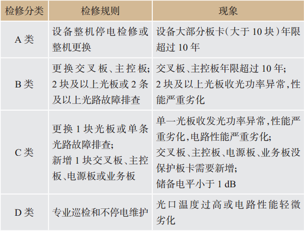 根據(jù)以上設備評分標準,分3檔對設備進行狀態(tài)區(qū)分:得分≤80分為“異常”,80分<得分≤90分為“注意”,得分>90分為“正常”。然后再根據(jù)設備現(xiàn)象安排不同級別檢修,根據(jù)檢修的影響程度分為“A類檢修”、“B類檢修”、“C類檢修”、“D類檢修”。檢修分類規(guī)則及現(xiàn)象描述見表5所列。