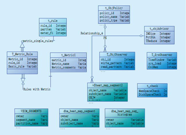 決策引擎的決策過程基于數(shù)據(jù)庫熱圖的幾個基礎(chǔ)視圖,如:v$heat_map_segment,以及本身策略庫的基礎(chǔ)表T_RULE和記錄決策引擎制定出的數(shù)據(jù)生命周期管理的方案T_OBJPOLICY,還有引擎運算使用的數(shù)據(jù)庫和操作系統(tǒng)各種狀態(tài)指標(biāo)的采集表。