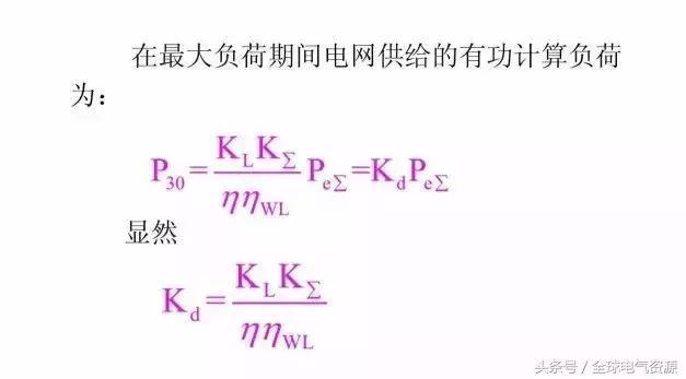 當只有一臺用電設備時,不能直接按表取需要系數(shù),這是因為影響需要系數(shù)的幾個因素除用電設備本身的效率η外均可能為1,此時的需要系數(shù)只包含了效率η,因此可得到P30 =Pe /η,由P30 、Q30 、S30 、I30 之間的關系得到如下公式: