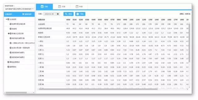 用能報表統(tǒng)計變電所各配電回路逐時、逐日、逐月用能,數(shù)據(jù)以表格形式顯示,并可導(dǎo)出至Excel中;