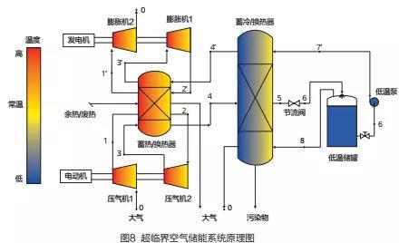 其工作原理是:1)儲(chǔ)能過程,利用富余電能通過壓縮機(jī)將空氣壓縮到超臨界狀態(tài),通過儲(chǔ)熱系統(tǒng)回收壓縮熱后,利用儲(chǔ)冷系統(tǒng)存儲(chǔ)的冷能將空氣冷卻液化,并儲(chǔ)于低溫儲(chǔ)罐中;2)釋能過程,液態(tài)空氣加壓后,通過儲(chǔ)冷系統(tǒng)將冷量儲(chǔ)存,空氣吸熱至超臨界狀態(tài),并吸收儲(chǔ)熱系統(tǒng)儲(chǔ)存的壓縮熱使空氣進(jìn)一步升溫,通過膨脹機(jī)驅(qū)動(dòng)電機(jī)發(fā)電。