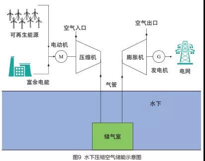 水下壓縮空氣儲(chǔ)能屬于等壓壓縮空氣儲(chǔ)能的一種,該技術(shù)將壓縮空氣存儲(chǔ)在水下(如海底和湖底),利用水的靜壓特性保持儲(chǔ)氣的壓力恒定,保證壓縮機(jī)出口及膨脹機(jī)入口壓力恒定,從而使壓縮機(jī)和膨脹機(jī)始終工作在額定工況附近,不需要通過減壓閥進(jìn)行壓力調(diào)整,減少能量損耗,提高系統(tǒng)效率。該系統(tǒng)不需要在儲(chǔ)氣空間保持一定的最小氣壓,使得空氣壓縮能可利用比率更高。此外,該系統(tǒng)安全性相對(duì)較高,即使發(fā)生失效事故,造成的破壞與危害也較小。
