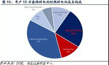 我們認(rèn)為氫能源燃料電池環(huán)節(jié)未來的機(jī)會(huì)有兩個(gè),一個(gè)是有技術(shù)壁壘的核心零部件,如質(zhì)子交換膜和空氣擴(kuò)散層;另一個(gè)是成本占比較高的部分,比如催化劑。成本占比較高的部分在理論上存在較大的降成本空間,會(huì)帶動(dòng)燃料電池整體成本下降,加速推進(jìn)燃料電池的需求爆發(fā)。