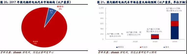 我們認(rèn)為在氫能源汽車環(huán)節(jié),短期內(nèi)仍是以商用車為主,在補(bǔ)貼政策激勵(lì)下,更多的傳統(tǒng)燃油商用車產(chǎn)能會(huì)向氫燃料電池汽車轉(zhuǎn)換。中長(zhǎng)期來看,乘用車仍是未來的主要市場(chǎng)。商用車(尤其是客車)可以簡(jiǎn)單地通過增加儲(chǔ)氫瓶增加續(xù)航能力,對(duì)儲(chǔ)氫技術(shù)的要求不高,同時(shí)國(guó)家的補(bǔ)貼力度大,因此商用車對(duì)成本敏感性低,這些因素決定了中國(guó)氫能源汽車市場(chǎng)首先爆發(fā)的是商用車市場(chǎng),之后在技術(shù)進(jìn)步與降成本的帶動(dòng)下,乘用車市場(chǎng)才會(huì)有大范圍應(yīng)用。