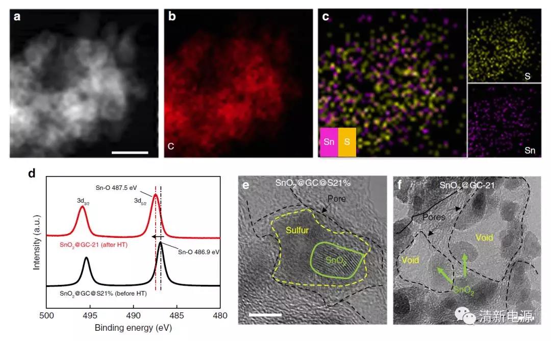 圖2 硫模板的特點。(a-c)硫與SnO2的相間分布狀態(tài);(d)XPS表征硫與SnO2間的相互作用;(e)HRTEM表征硫?qū)nO2的緊密包裹;(f)擁有合適預(yù)留空間的碳籠結(jié)構(gòu)對SnO2顆粒的限域。