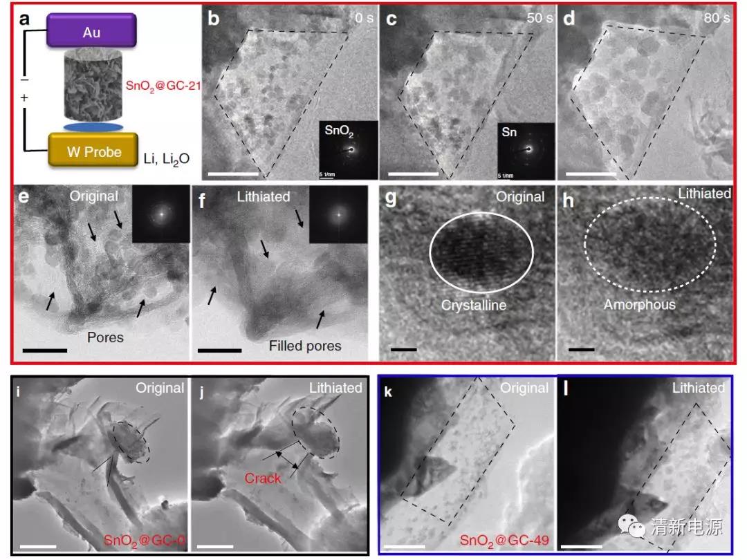 圖5 原位透射電鏡表征。原位條件下觀察(a-h)預(yù)留空間合適,(i-j)預(yù)留空間不足,(k-l)預(yù)留空間過剩的碳籠結(jié)構(gòu)對SnO2顆粒嵌鋰膨脹的緩沖效果。