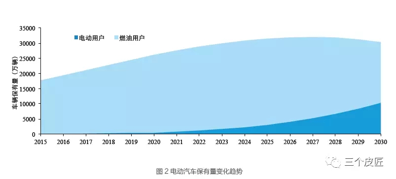 通過整理近期上市的騰勢(400)、北汽EU400、上汽榮威ERXEV400 等車型數(shù)據(jù)不難發(fā)現(xiàn),較老款車型新上市電動車型動力電池容量有較大增加。北汽EU 400 在保持售價與老款EU 260 基本持平的情況下,采用了孚能三元材料鋰電池,電池容量達(dá)到54.4 千瓦時(+31.4%),能量密度達(dá)到125Wh/kg,標(biāo)定續(xù)航里程360 公里(+38.5%),60km/h 等速行駛工況下續(xù)駛里程可達(dá)到460 公里;秦2017 款圖 2 電動汽車保有量變化趨勢插電式混合動力車型電池組容量達(dá)到17 千瓦時(較2015 款車型提高31%),純電動續(xù)航里程達(dá)到100 公里(較2015 款車型提高43%)。表2 為《節(jié)能與新能源汽車技術(shù)路線圖》中動力電池技術(shù)分階段發(fā)展目標(biāo),到2030 年動力電池單體比能量Ⅴ 將達(dá)到500 瓦時/ 千克,是目前水平的2 倍以上 。