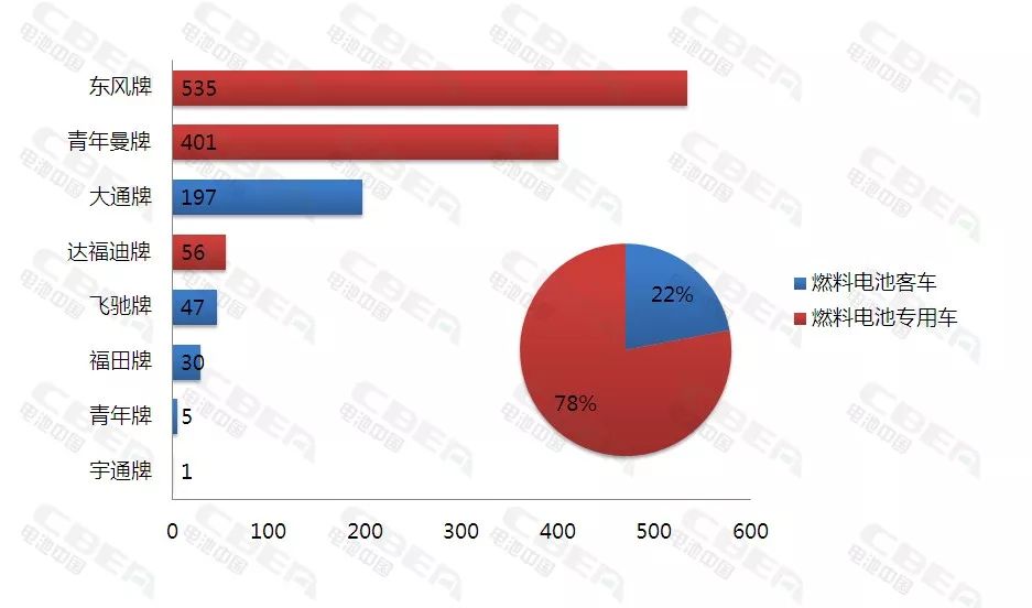 圖1:2017年新能源汽車推薦目錄中各品牌燃料電池車獲批車型量及類型占比