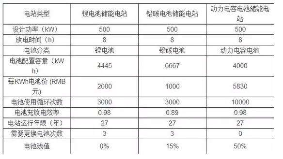 以三種不同電池,按照500kW-8h(4000kWh)儲(chǔ)能電站,分別比較儲(chǔ)能電站成本與效益。見下表1~表2。表1 三種不同電池儲(chǔ)能電站參數(shù)表對(duì)表1的參數(shù)