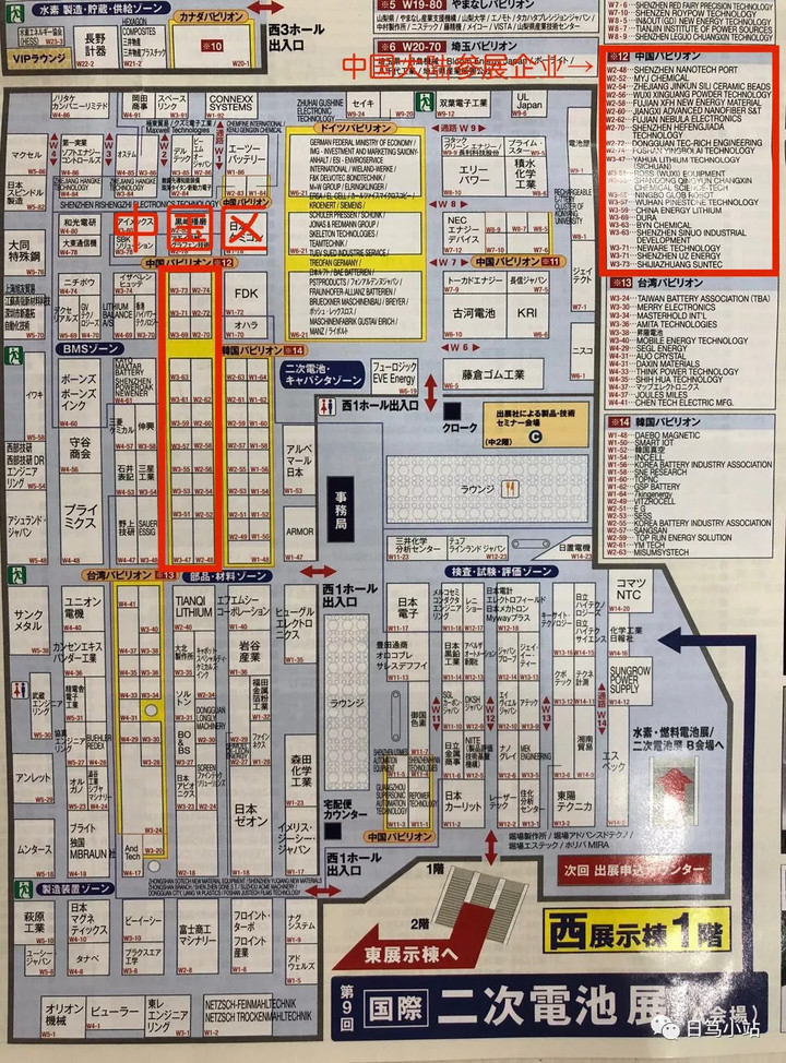 會(huì)場(chǎng)1樓主要為鋰電池展,會(huì)場(chǎng)2樓主要為燃料電池展。從展區(qū)平面圖上我們可以看出,中國(guó)企業(yè)展區(qū)占了很大一部分(這之中不計(jì)未出展中國(guó)企業(yè),但有參加展會(huì)人員)。同時(shí)也可以看出,鋰電池展會(huì)中并沒有像Panasonic,SONY,GS Yuasa等傳統(tǒng)日本電池企業(yè)的身影,他們干嘛去了?