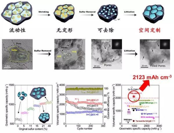 硫模板法的提出,是在三維石墨烯致密網(wǎng)絡(luò)中,巧妙利用硫如同“變形金剛”一樣的流動(dòng)性、無定形,以及易去除等特點(diǎn),在碳籠結(jié)構(gòu)內(nèi)部實(shí)現(xiàn)對(duì)非碳活性顆粒如二氧化錫納米顆粒的緊密包覆。與傳統(tǒng)的“形狀”模板相比,硫模板的最大優(yōu)勢(shì)就是能發(fā)揮可塑型的體積模板作用,使緊致的石墨烯籠結(jié)構(gòu)能夠提供適形且尺寸精確可控的預(yù)留空間,最終完成針對(duì)活性二氧化錫的“量體裁衣”。這種具有合適預(yù)留空間且保持高密度的碳-非碳復(fù)合電極材料能貢獻(xiàn)出極高的體積比容量,從而大幅度提高鋰離子電池的體積能量密度,使鋰離子電池變得更小。這種 “量體裁衣”的設(shè)計(jì)思想可以拓展為普適化的下一代高能鋰離子電池和鋰硫電池、鋰空氣電池等電極材料的構(gòu)建策略。
