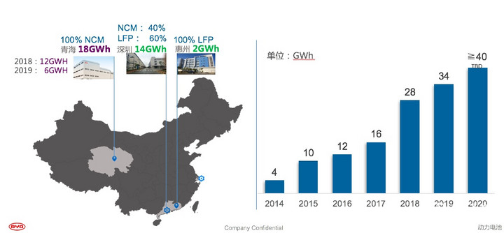 2019年青?;亟ǔ珊?,比亞迪在中國的動力電池年產(chǎn)能可達到34GWh。青海基地全部生產(chǎn)三元電池,年產(chǎn)能高達18GWh;深圳基地年產(chǎn)能14GWh,三元電池占40%;而比亞迪惠州基地則專注于磷酸鐵鋰電池的生產(chǎn),年產(chǎn)能為2GWh。