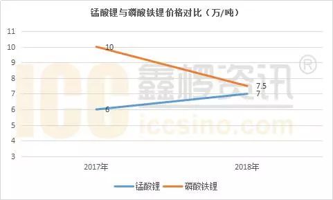 2017年以來,受產(chǎn)能過剩影響,磷酸鐵鋰價格持續(xù)下滑,截止到2018年4月,市場主流成交價已至7.5萬/噸,個別廠家出貨至儲能領域的產(chǎn)品低至7萬/噸;與之形成鮮明對比的,錳酸鋰市場卻產(chǎn)銷兩旺——根據(jù)鑫欏資訊統(tǒng)計,2017年國內(nèi)錳酸鋰產(chǎn)量達3.5萬噸,同比增長34%,高端動力型產(chǎn)品也從6萬/噸一路上漲至7萬/噸。