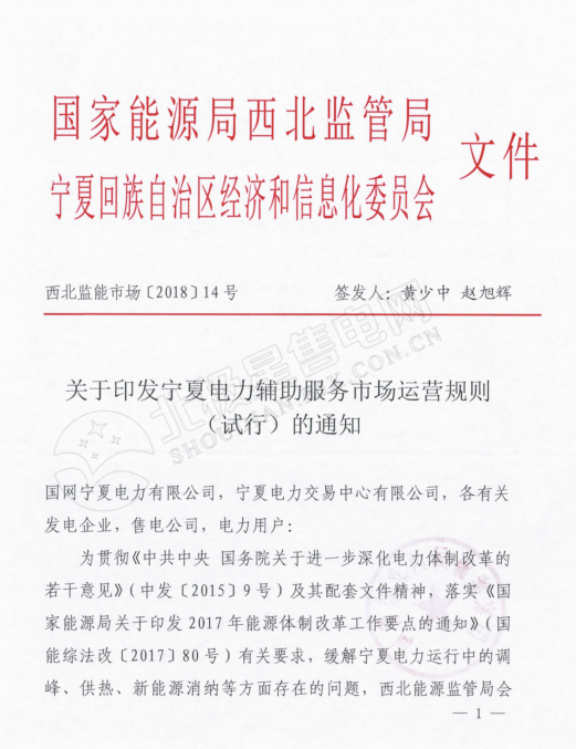 2018年3月22日,西北能監(jiān)局、寧夏回族自治區(qū)經(jīng)信委聯(lián)合下發(fā)了《寧夏電力輔助服務(wù)市場運(yùn)營規(guī)則(試行)的通知》,將解決寧夏電力運(yùn)行中的調(diào)峰