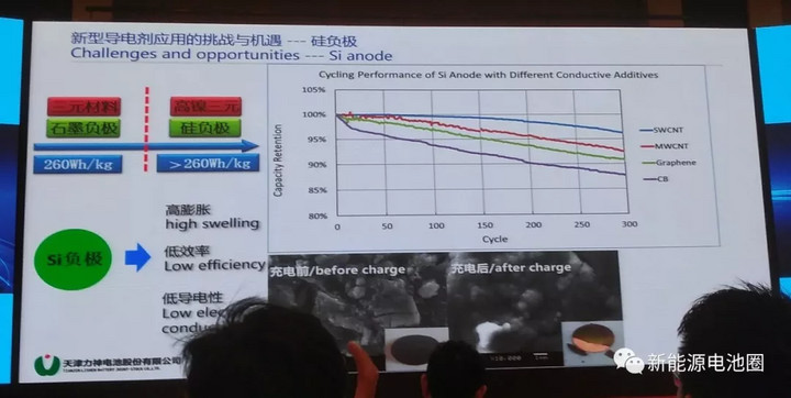 第二個報告來自天津力神王琳經理,分享了炭黑,石墨烯,以及新型單壁碳管在硅負極的應用現(xiàn)狀和問題。