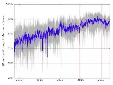 圖4顯示了PJM系統(tǒng)平均性能得分的變化情況。調節(jié)資源性能基于三個指標:準確性、延遲性和精確度。準確性是資源響應調節(jié)信號的快慢;延遲性為從開始運動到達到預期的延遲時間;精確度是信號和響應之間瞬時錯誤。