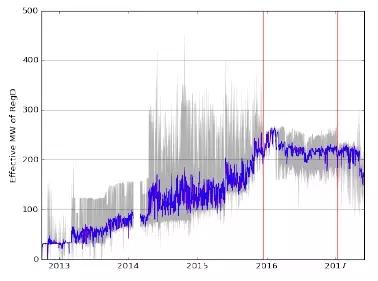調頻輔助服務市場規(guī)則調整后RegD資源所提供的有效任務量降低了。圖3展現(xiàn)了效益因子調整后RegD任務量變化情況。引入快速信號之后,RegD資源調節(jié)任務量逐步提高,儲能項目建設也隨之加快。2015年12月短期市場調整后RegD資源調節(jié)任務量增長趨勢終止。這些調整限制了日內每小時RegD任務量。最終,2017年1月信號規(guī)則調整導致了RegD任務量出現(xiàn)下降。