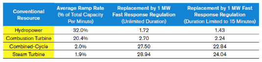 發(fā)電廠等傳統(tǒng)資源通過調節(jié)轉速響應調頻信號,存在時間延遲。換句話講,電廠調節(jié)出力需要花費時間。儲能資源幾乎可瞬時調節(jié),既在一分鐘之內實現(xiàn)100%的功率調節(jié)。2008年太平洋西北國家實驗室研究發(fā)現(xiàn)1 MW快速調節(jié)資源可提供等效調節(jié)服務為1.7 MW水力發(fā)電機組、2.7 MW的燃氣機組和29 MW 燃煤機組。