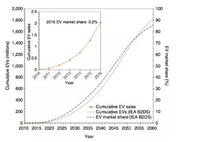 圖1. 國(guó)際能源署“高于2攝氏度方案”中提出的電動(dòng)汽車銷售和電動(dòng)汽車市場(chǎng)共享演進(jìn)圖