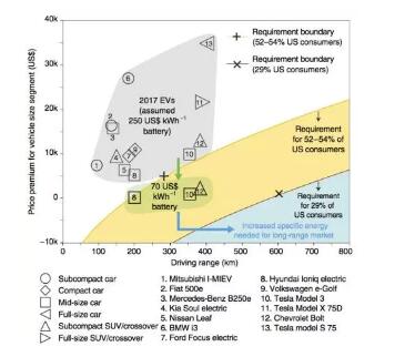 發(fā)展新能源汽車是各國(guó)的國(guó)家戰(zhàn)略抉擇,但是在減緩氣候變暖的大格局下,電動(dòng)汽車的發(fā)展仍然不盡如人意,如圖1所示。鋰離子電池是當(dāng)前最具實(shí)用價(jià)值的電動(dòng)汽車動(dòng)力來(lái)源,然而它的低能量密度和高成本遠(yuǎn)遠(yuǎn)不能滿足未來(lái)的電動(dòng)車市場(chǎng)需求。例如在2016年的一項(xiàng)調(diào)查中發(fā)現(xiàn),美國(guó)消費(fèi)者中超過(guò)一半的人難以接受購(gòu)買(mǎi)續(xù)航里程280公里以下且超過(guò)普通燃油車價(jià)格5000美元的電動(dòng)汽車。令人遺憾的是,圖2表明目前市場(chǎng)上仍未出現(xiàn)完全滿足如上需求的電動(dòng)車。雖然鋰離子電池包預(yù)計(jì)2030至2040年能降至70美元/千瓦時(shí),但即使是最具性價(jià)比的三款電動(dòng)汽車仍有三成左右的消費(fèi)者不愿意購(gòu)買(mǎi)。除了價(jià)格因素,鋰離子電池包的安全性和快充能力仍然需要進(jìn)一步提高以獲得市場(chǎng)更為廣泛的接納。