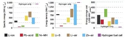 圖3.可充電電池與氫燃料重量能量密度,體積能量密度以及能量存儲(chǔ)系統(tǒng)的成本