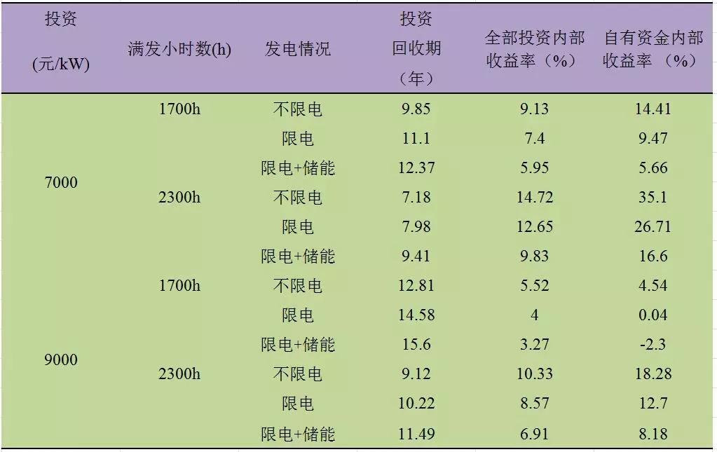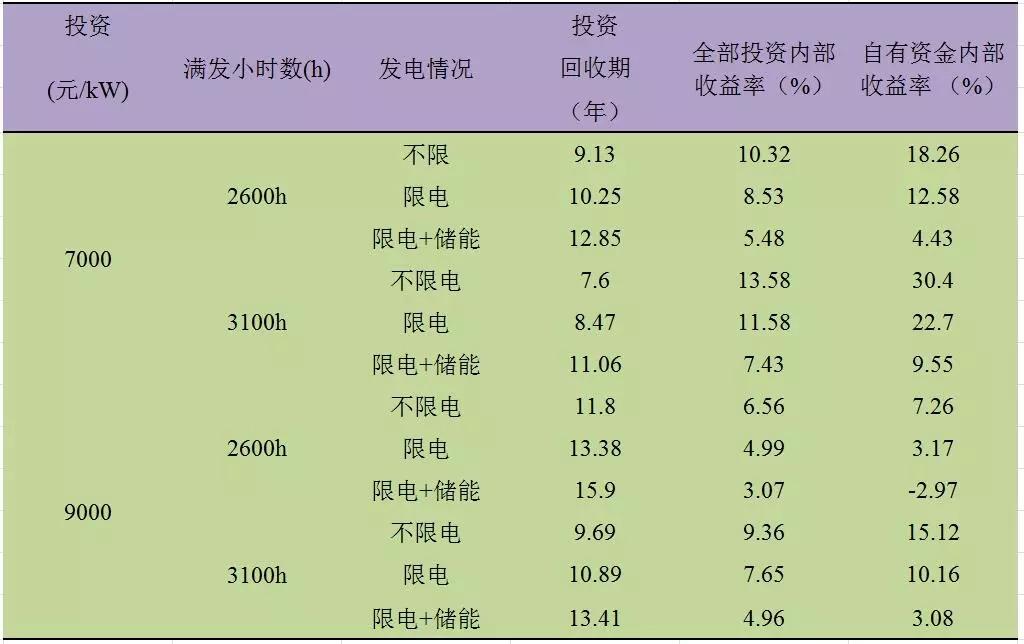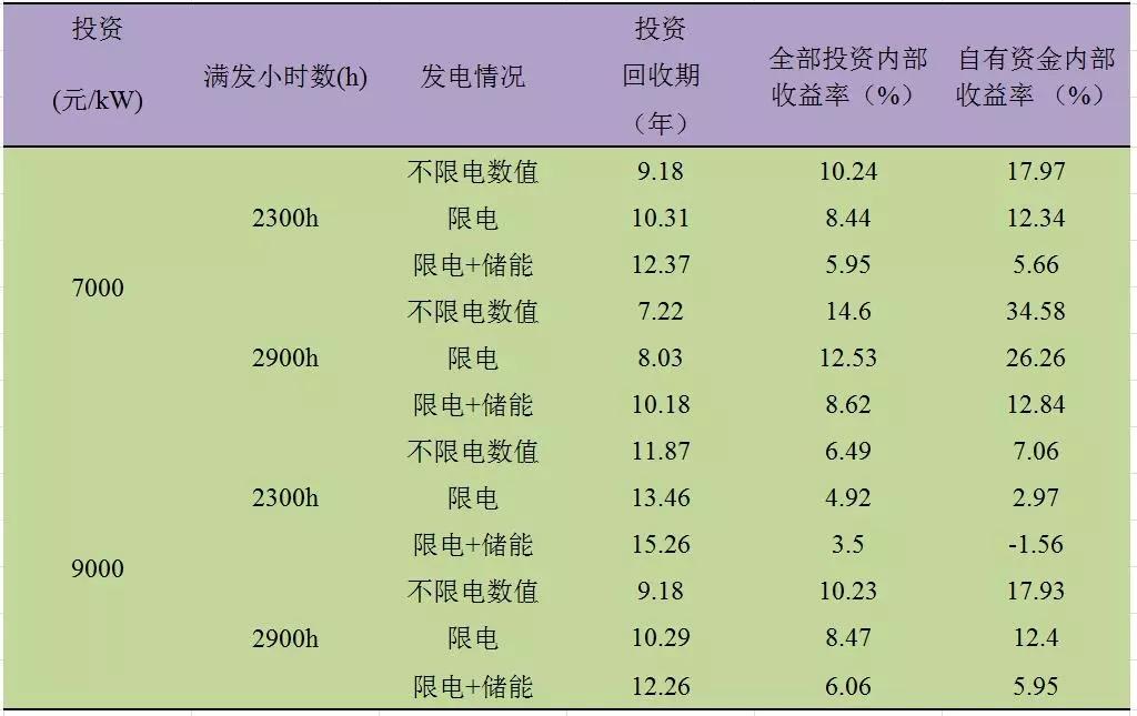 Ⅱ類電價(jià)區(qū)的滿發(fā)小時(shí)數(shù)在2300h-2900h之間。通過(guò)測(cè)算,經(jīng)濟(jì)性指標(biāo)匯總結(jié)果匯總?cè)绫?所示: