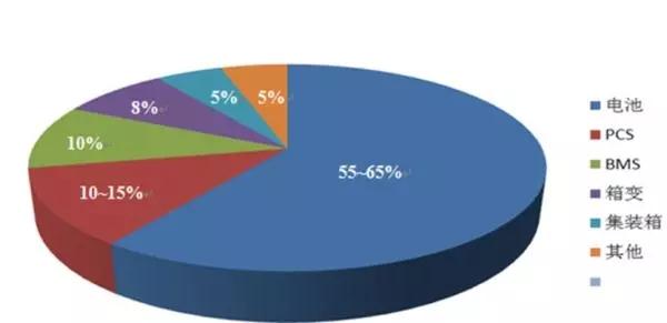 儲(chǔ)能系統(tǒng)的構(gòu)成主要包括電池單元,電池管理系統(tǒng)(BMS)、能量轉(zhuǎn)換系統(tǒng)(PCS),中央控制系統(tǒng)。儲(chǔ)能系統(tǒng)由儲(chǔ)能變流器(PCS)、蓄電池儲(chǔ)能單元、蓄電池管理系統(tǒng)(BMS)和預(yù)裝式集裝箱組成。各單元投資比例如圖1: