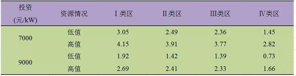Ⅳ類電價(jià)區(qū)的25年平均滿發(fā)小時(shí)數(shù)為1700h-2300h。經(jīng)計(jì)算經(jīng)濟(jì)性指標(biāo)參數(shù)結(jié)果匯總?cè)绫?所示: