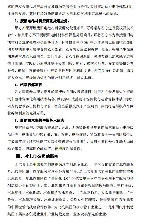 北汽集團(tuán)是中國領(lǐng)先的新能源汽車制造企業(yè)之一,本次合作交易方北汽鵬龍是北汽集團(tuán)旗下汽車服務(wù)貿(mào)易業(yè)務(wù)發(fā)展平臺(tái),是北汽集團(tuán)汽車主業(yè)產(chǎn)業(yè)鏈的重要組成部分,是北汽集團(tuán)在“集團(tuán)化2.0”時(shí)代實(shí)現(xiàn)由生產(chǎn)型企業(yè)向生產(chǎn)服務(wù)型和創(chuàng)新型企業(yè)轉(zhuǎn)型的主力軍。北汽鵬龍目前業(yè)務(wù)涵蓋汽車銷售與服務(wù)、平行進(jìn)口、汽車配件、汽車物流、汽車租賃和出租車、二手車及拍賣、大宗物資采購、廣告?zhèn)髅健⑵囇h(huán)經(jīng)濟(jì)、汽車定制改裝、保險(xiǎn)專業(yè)代理等,是梅賽德斯-奔馳重要的中國經(jīng)銷商戰(zhàn)略合作伙伴,為北汽集團(tuán)的核心骨干企業(yè)之一。是中國汽車制造集團(tuán)下屬服務(wù)貿(mào)易企業(yè)中產(chǎn)業(yè)鏈最完整、業(yè)務(wù)規(guī)模領(lǐng)先的企業(yè)。