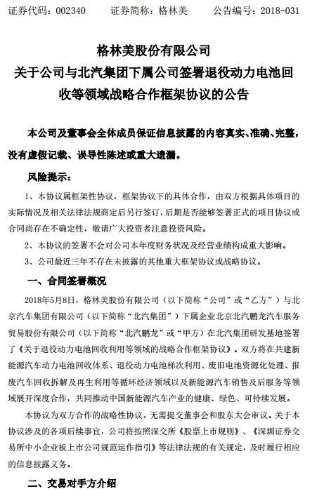 格林美股份有限公司(以下簡稱“公司”或“乙方”)與北京汽車集團(tuán)有限公司(以下簡稱“北汽集團(tuán)”)下屬企業(yè)北京北汽鵬龍汽車服務(wù)貿(mào)易股份有限公司(以下簡稱“北汽鵬龍”或甲方)在北汽集團(tuán)研發(fā)基地簽署了《關(guān)于退役動(dòng)力電池回收利用等領(lǐng)域的戰(zhàn)略合作框架協(xié)議》。